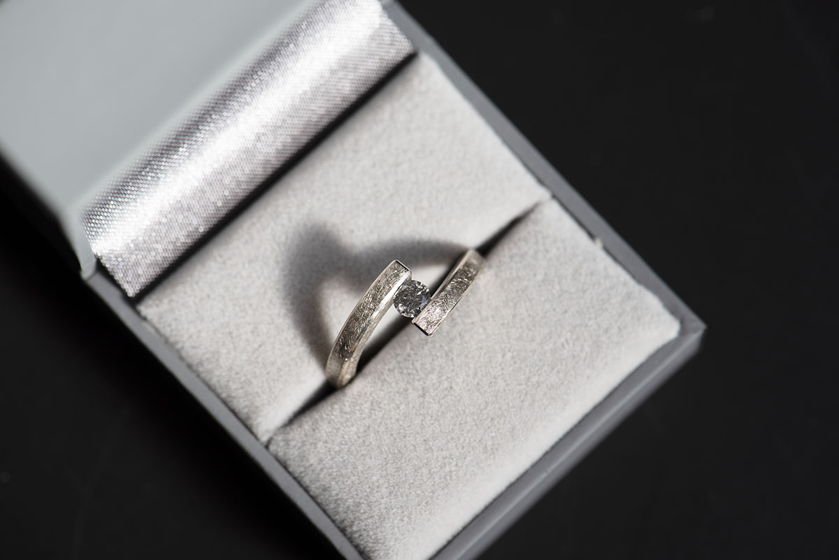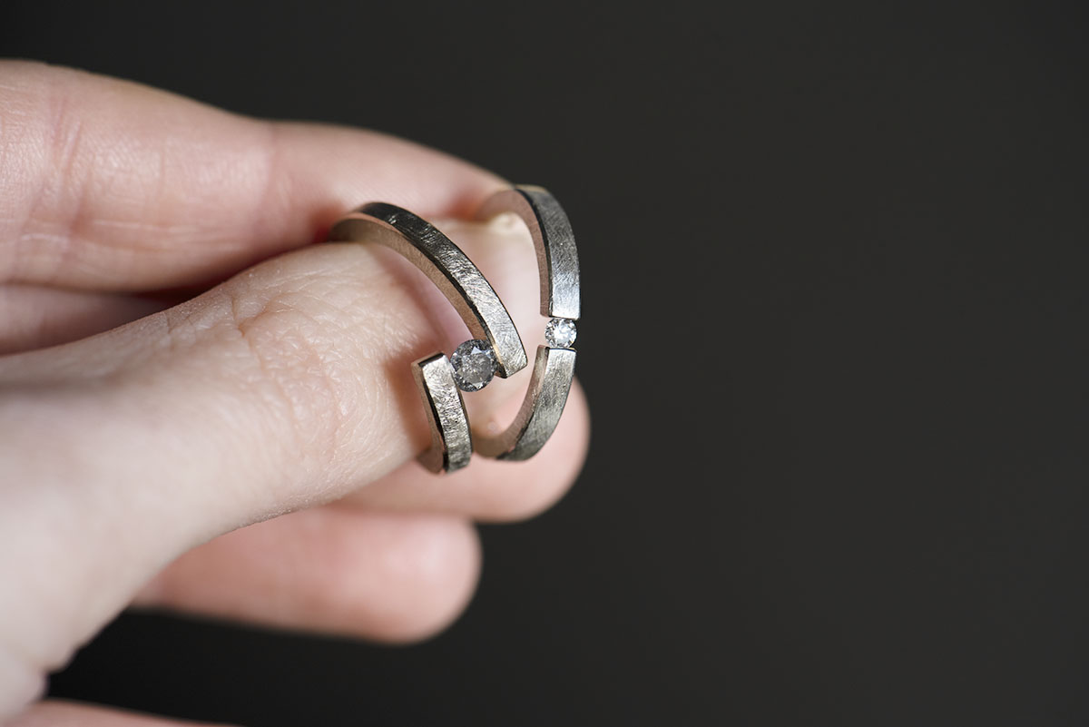 Kamień jest ściskany bokami mijającej się szyny – jest to oprawa typu „tension ring” i stabilnie utrzymuje kamień na miejscu.
