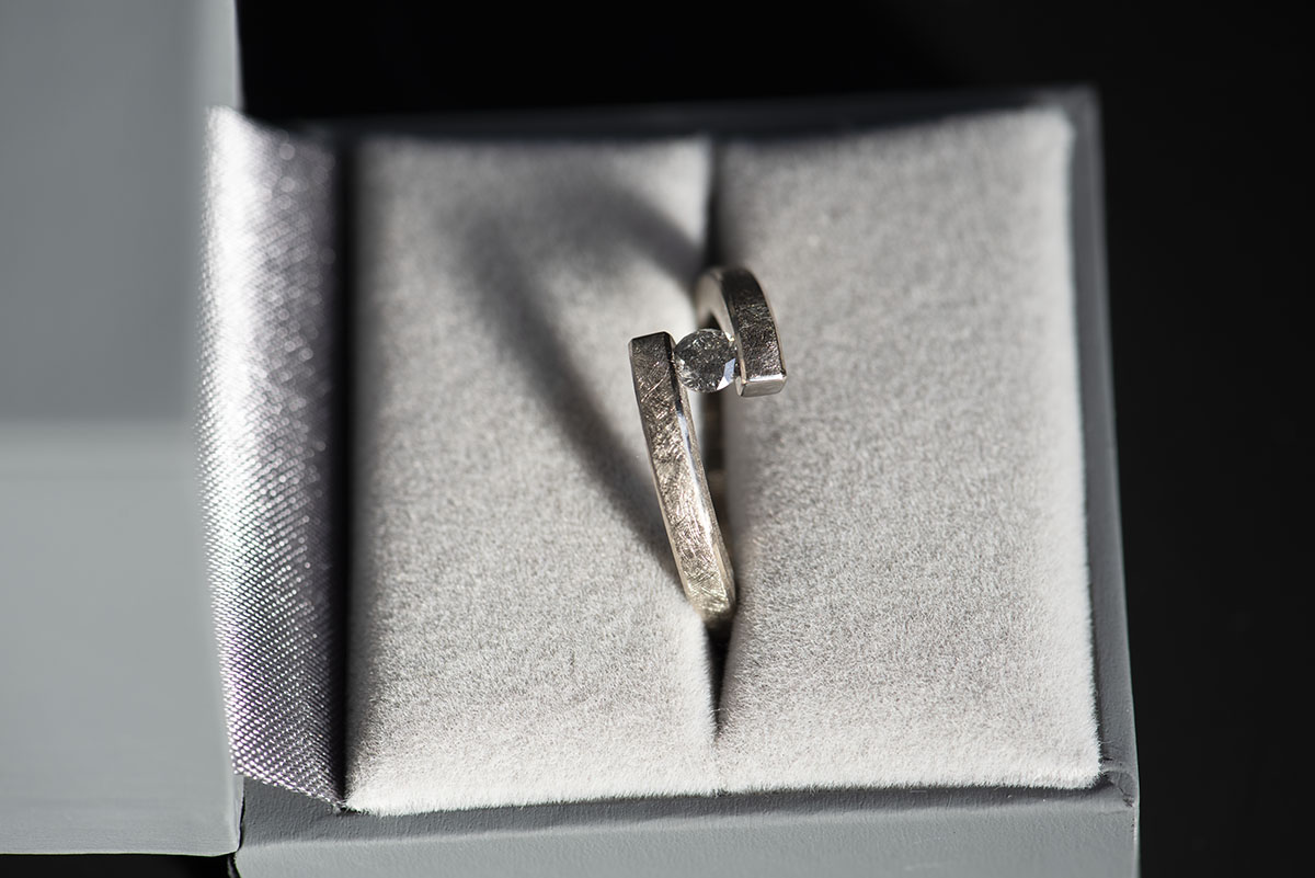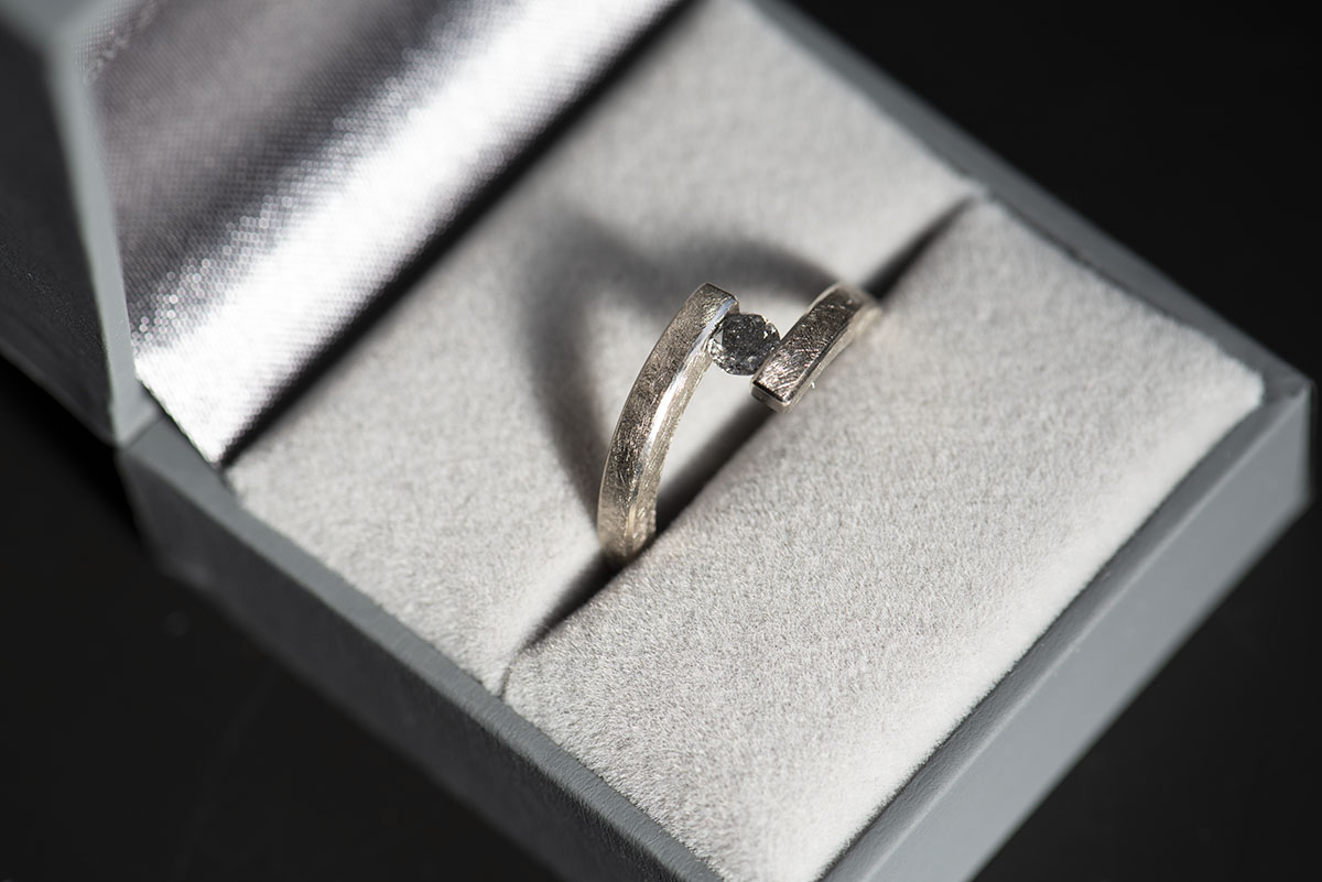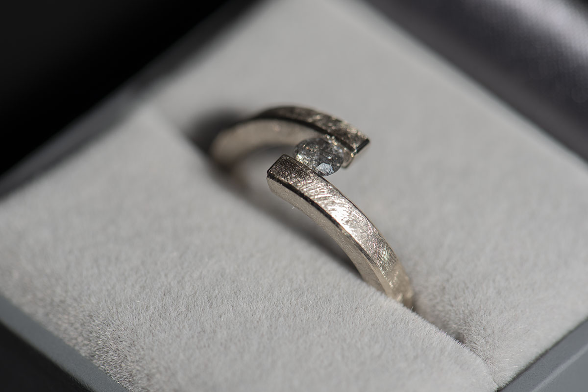 Pierścionek zamówiła u nas klientka – dla siebie, z okazji 50-tych urodzin. Jest z jednej strony niezwykle prosty, a z drugiej bardzo przykuwa uwagę. Podrapane wykończenie nierodowanego białego złota niezwykle pięknie komponuje się z diamentem sól i pieprz. Zarówno metal jak i kamień nienachalnie mienią się w słońcu i podkreślają surowość całego wzoru.