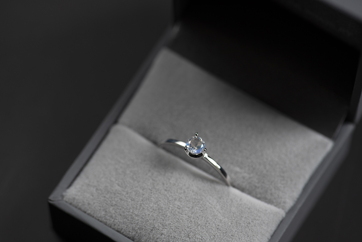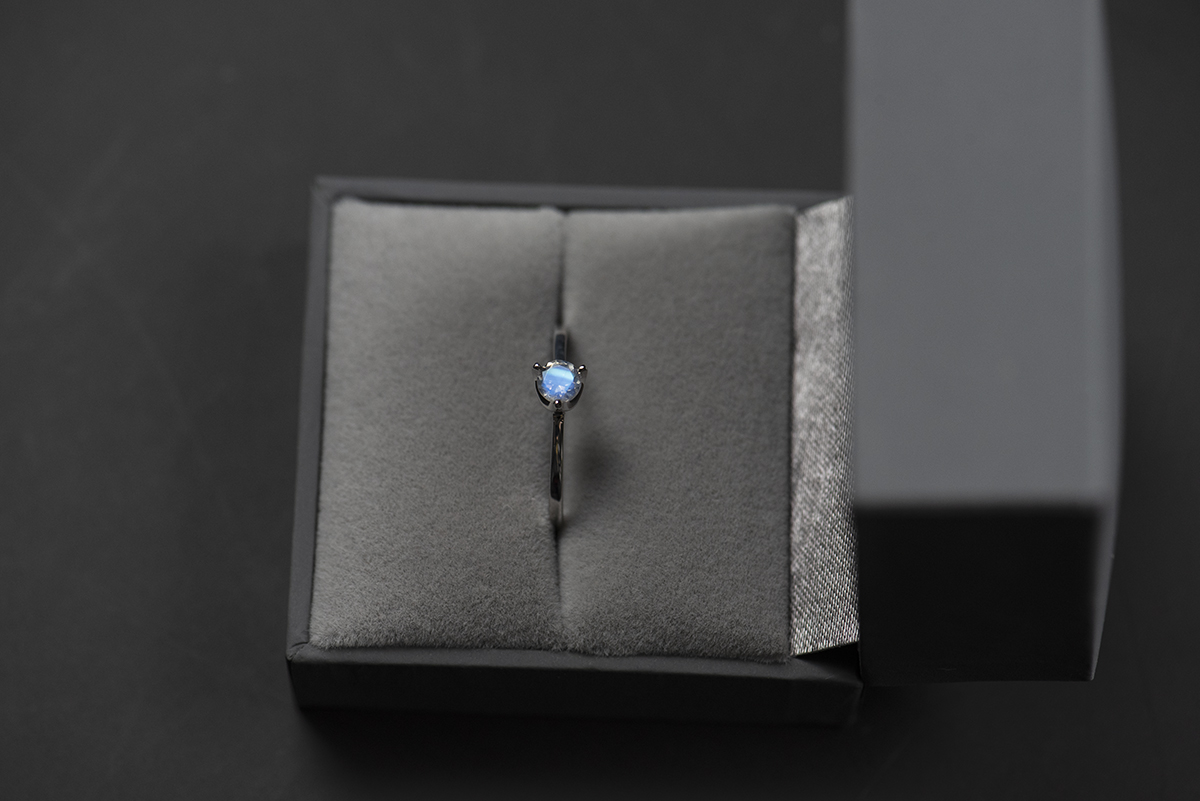 Prosty pierścionek bazujący na bardzo klasycznym rozwiązaniu – prosta szyna i kamień uchwycony w łapy. Projekt ma jednak nowoczesne akcenty w postaci asymetrycznego ułożenia trzech łap oprawy oraz wyjątkowego kamienia, jakim jest kamień księżycowy.