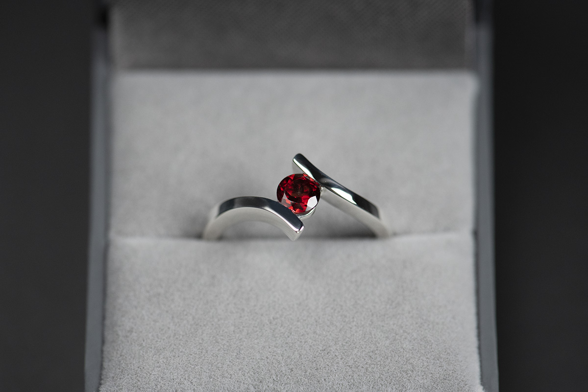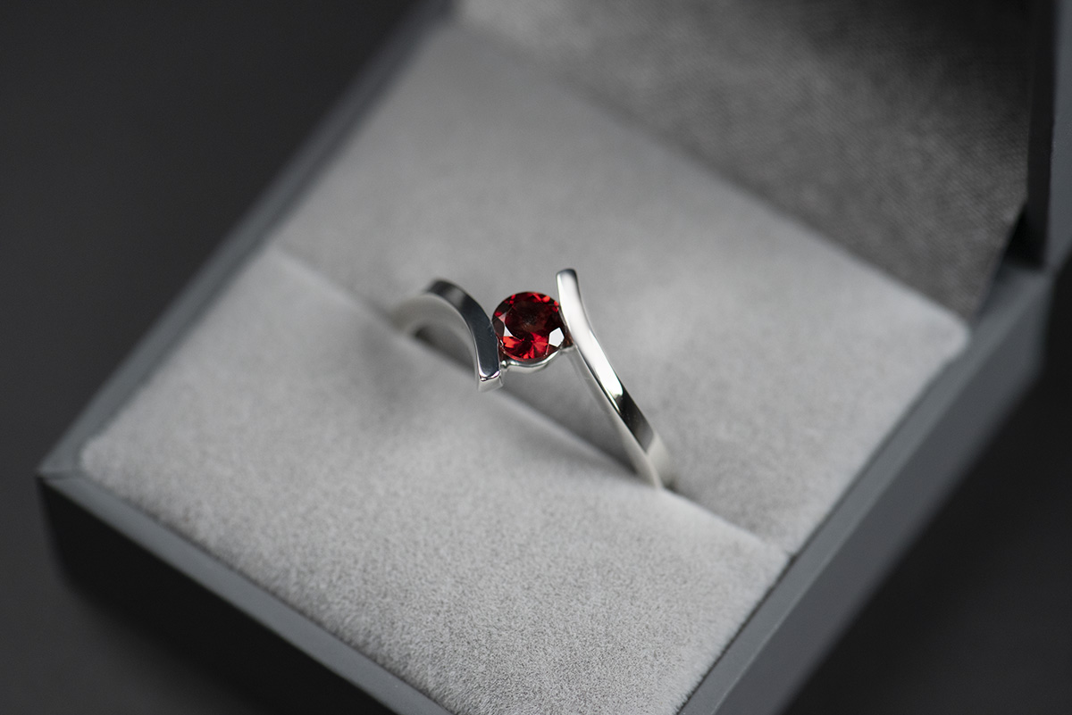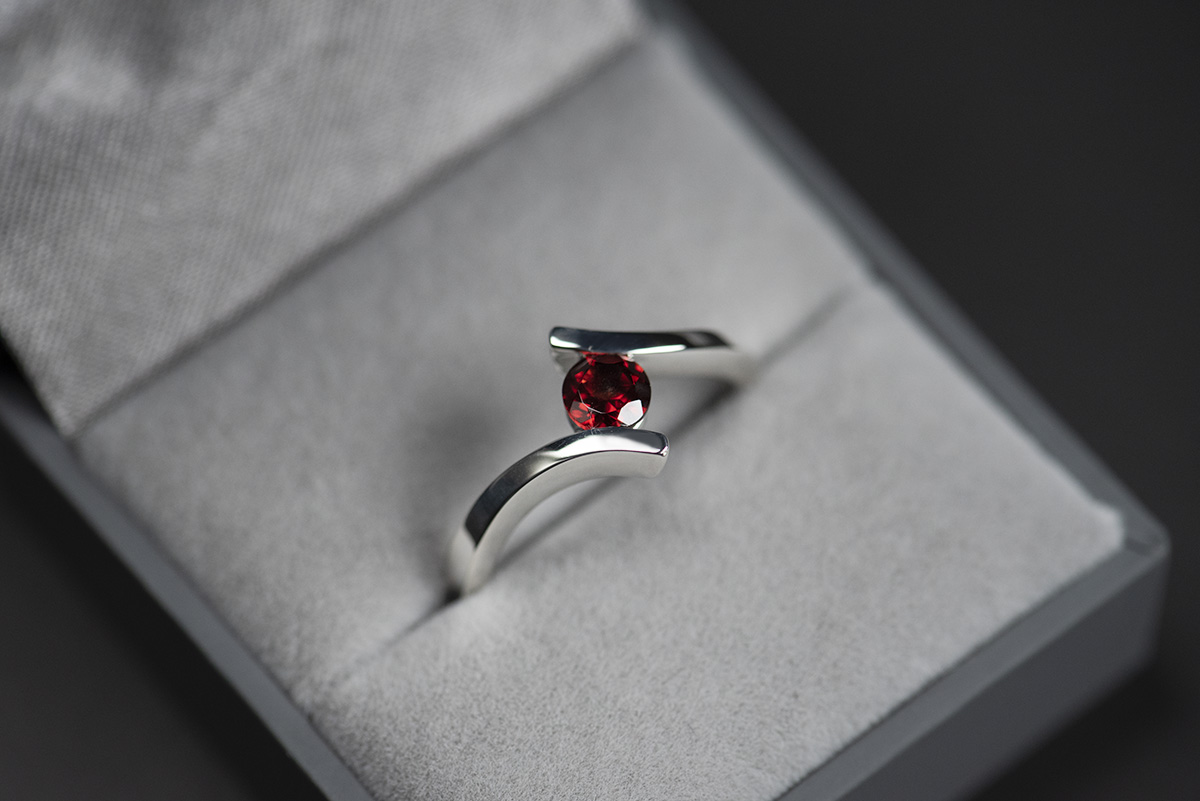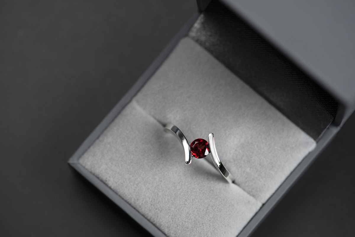 Wzór pierścionka z granatem nawiązuje (może w mało oczywisty sposób) do pierścionków klasycznych z kolekcji Chevron – jedna część szyny została poprowadzona jak w lustrzanym obliczu i w ten sposób powstała mijanka. Jest ona częścią kolekcji Chevron, o której można więcej przeczytać w naszej galerii.