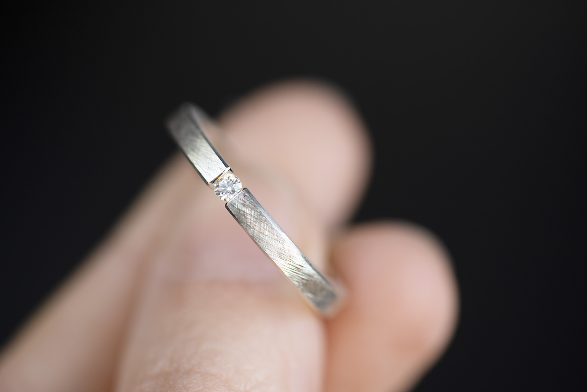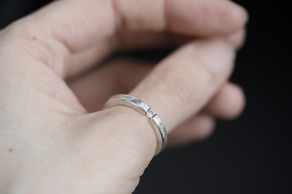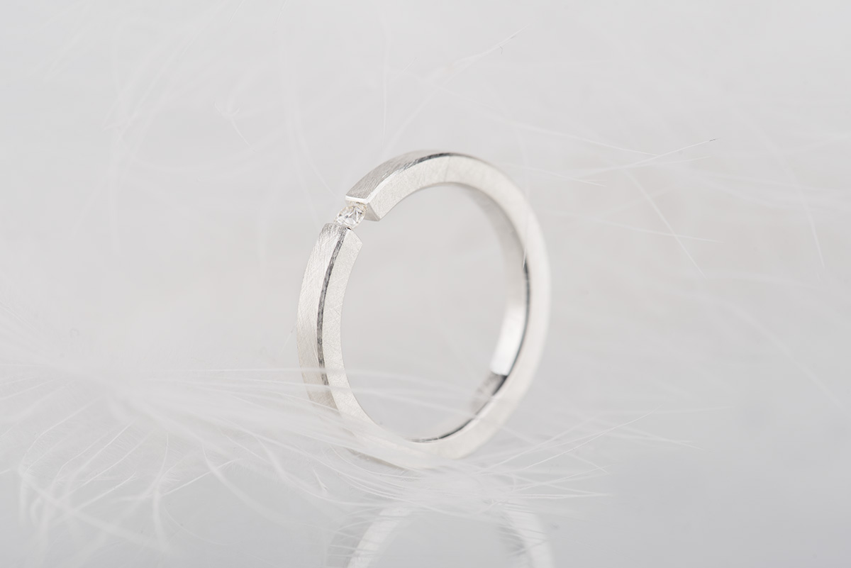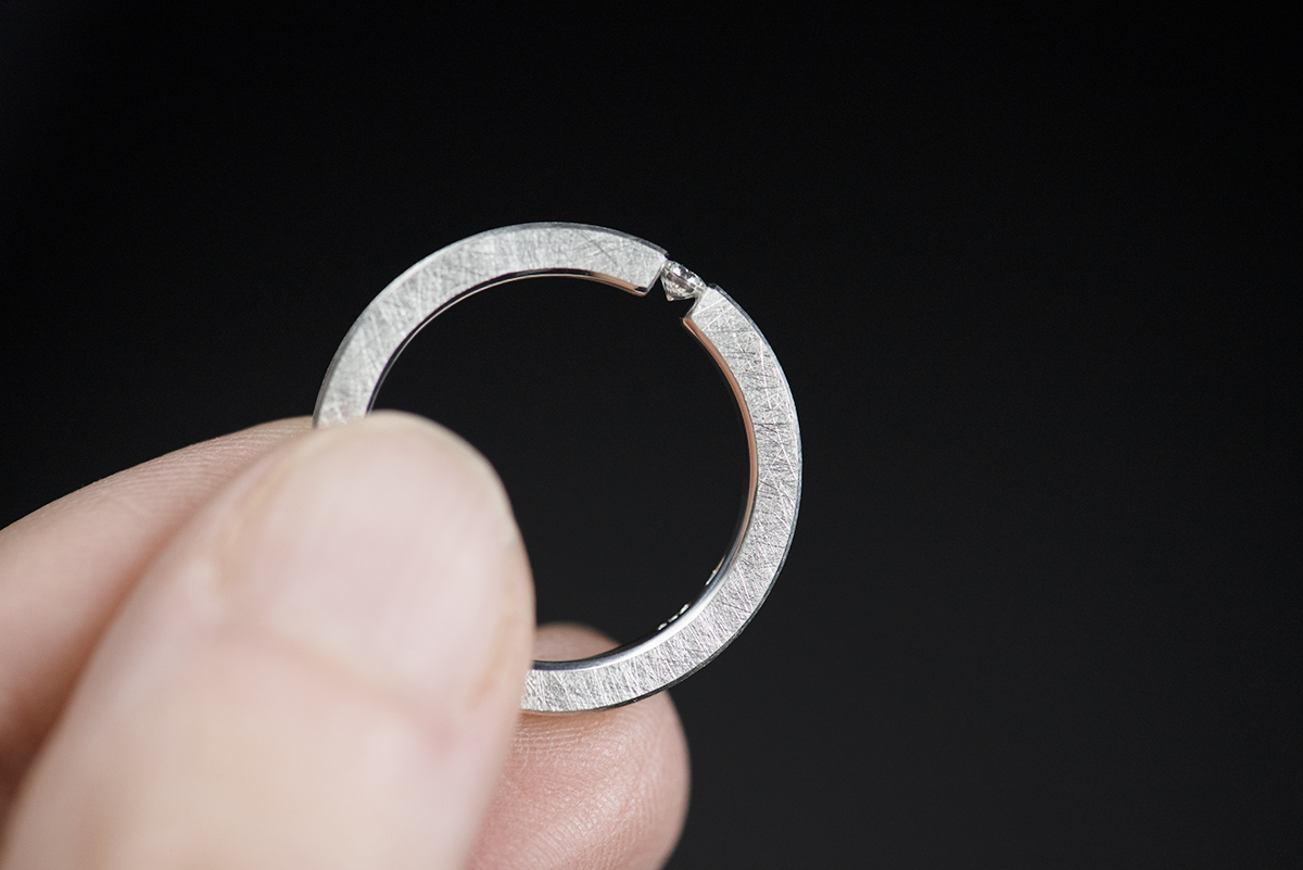 W pierścionku wykorzystaliśmy rzadki typ oprawy (ang. tension ring), polegający na ściśnięciu z dużą siłą kamienia, umieszczonego pomiędzy końcami szyny. Proporcje i wymiary szyny są tak obliczone, żeby w pełni zabezpieczyć kamień przed wypadnięciem.