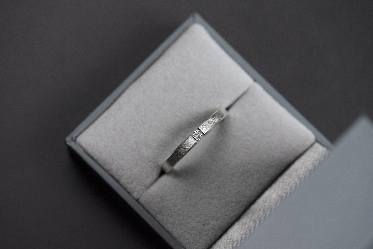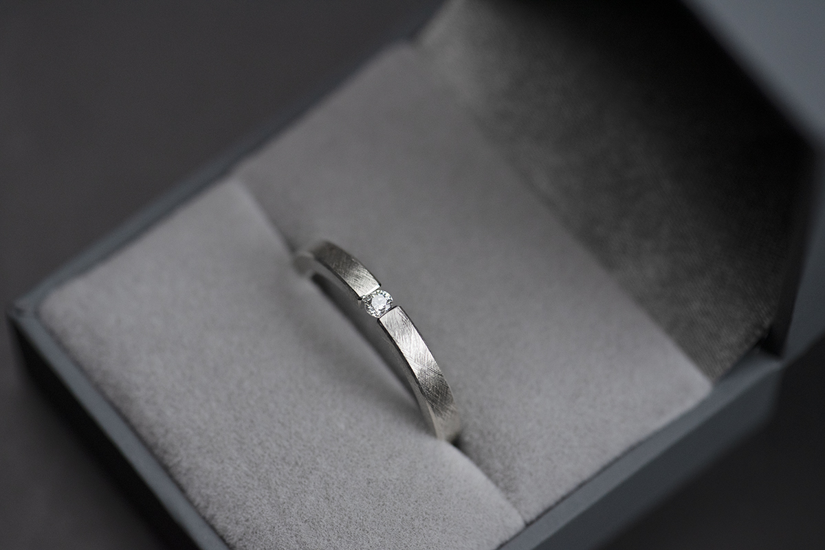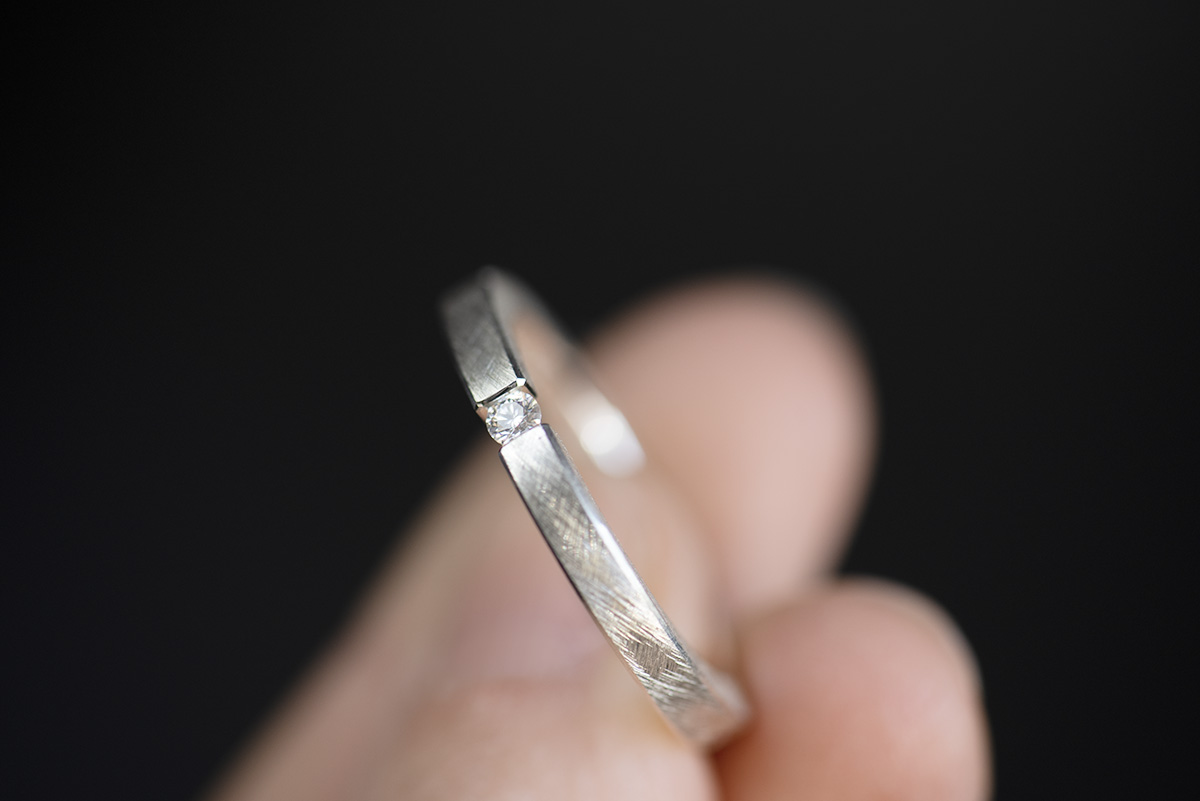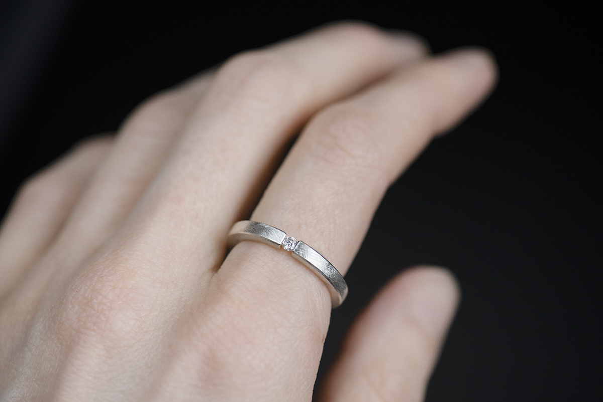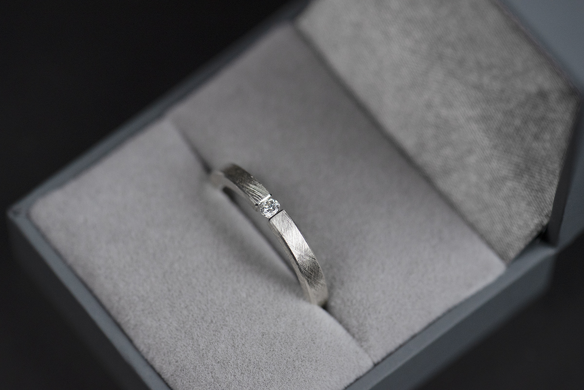 W pierścionku wykorzystaliśmy rzadki typ oprawy (ang. tension ring), polegający na ściśnięciu z dużą siłą kamienia, umieszczonego pomiędzy końcami szyny. Proporcje i wymiary szyny są tak obliczone, żeby w pełni zabezpieczyć kamień przed wypadnięciem.
