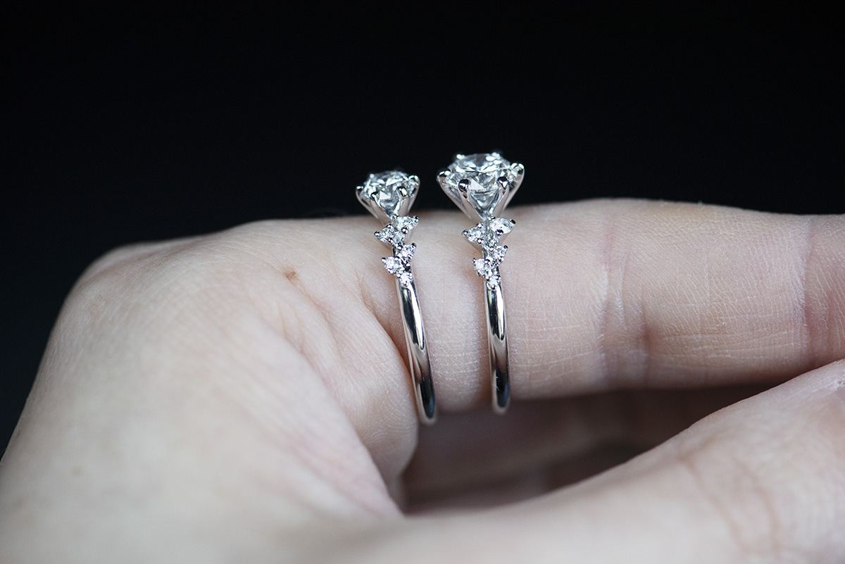 - Pierścionek z mniejszymi kamieniami głównymi znajdziesz tutaj i tutaj. Na ostatnich zdjęciach porównanie pierścionków z diamentami 0,5 ct (5 mm) oraz 1 ct (6,5 mm)
