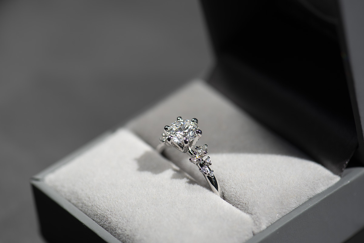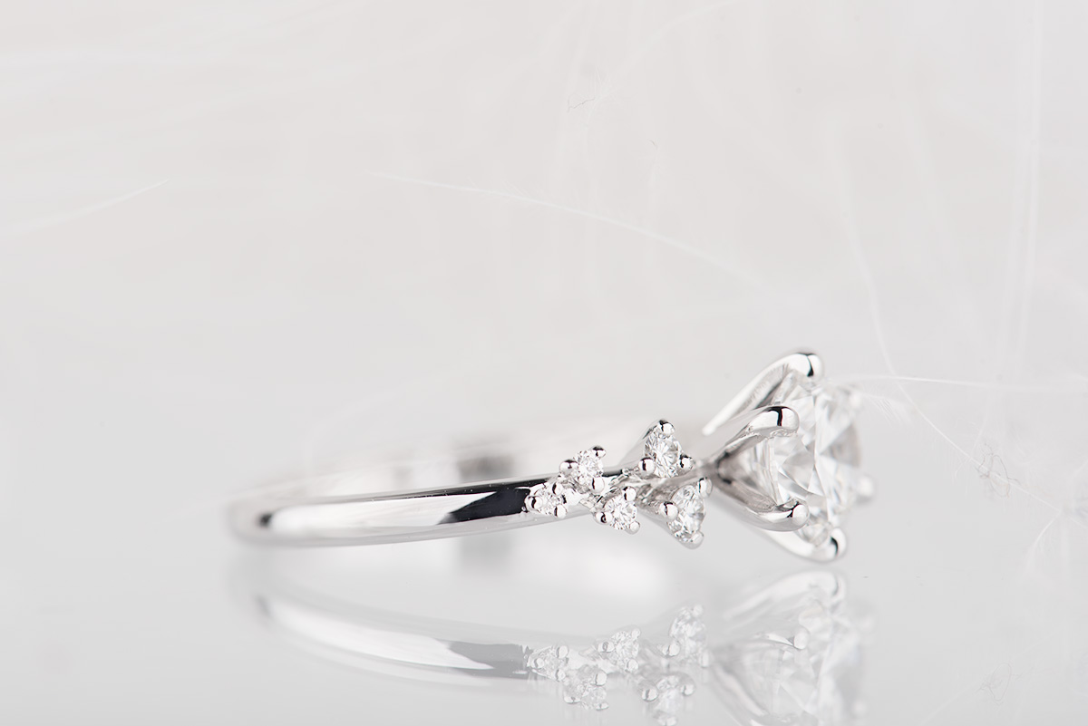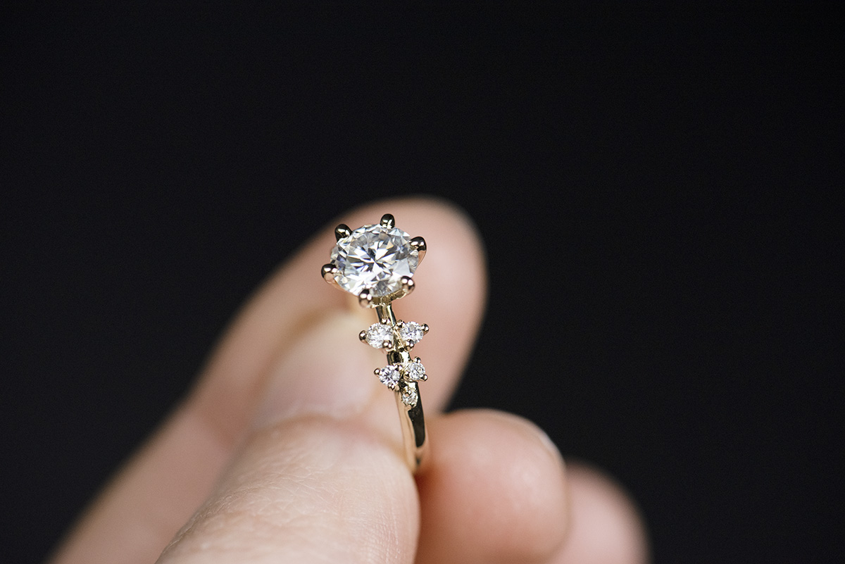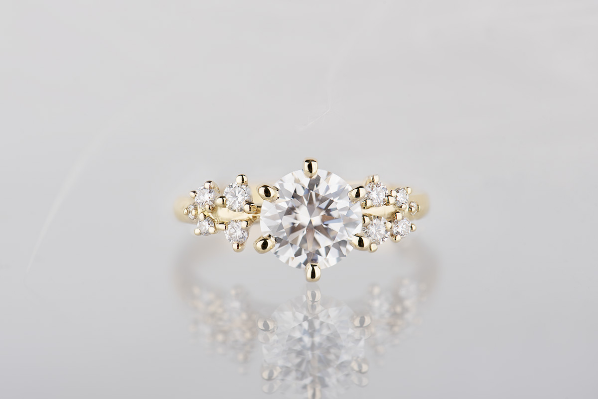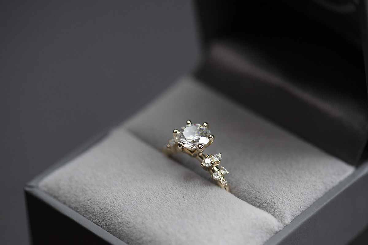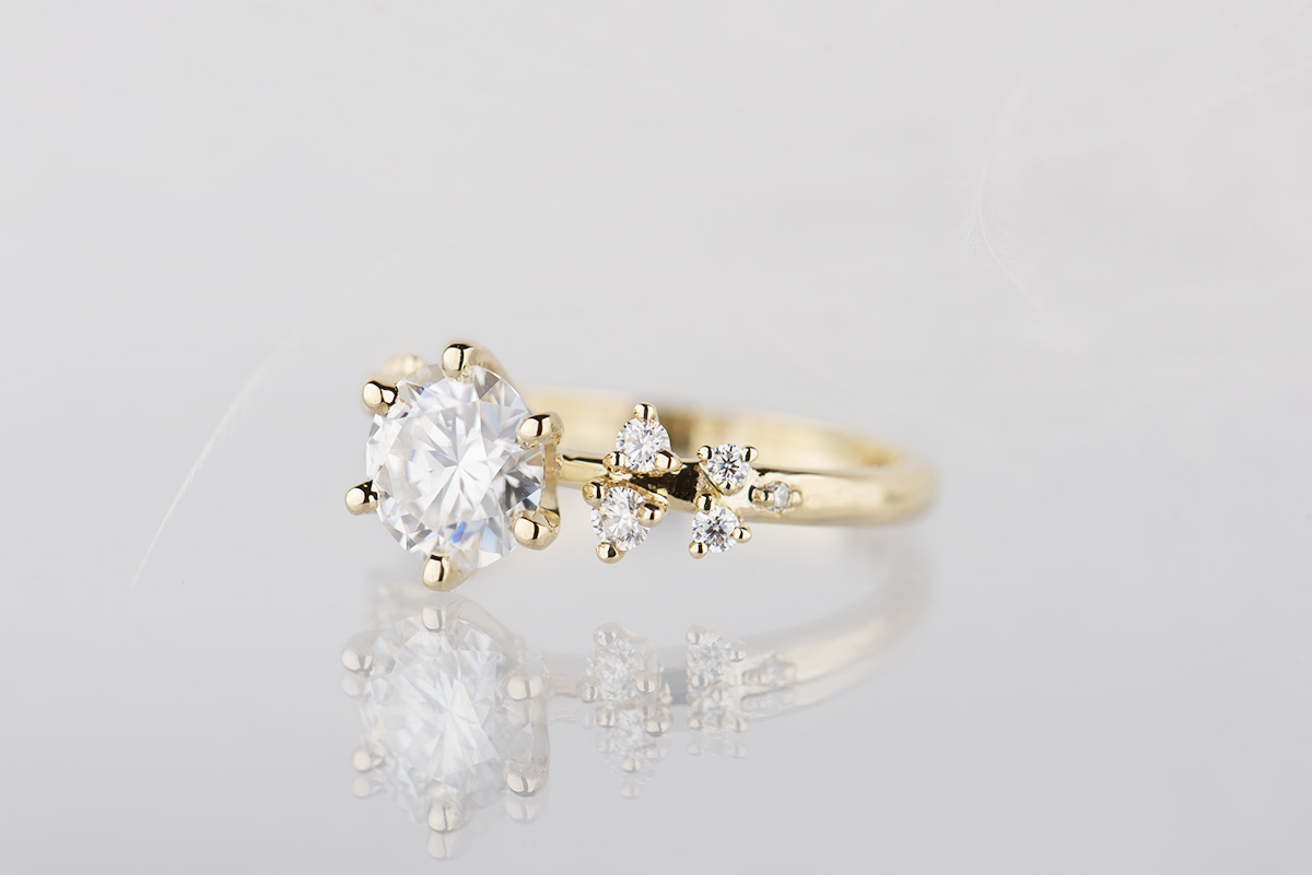 - Kamień główny: laboratoryjny diament (zawsze staramy się zamówić kamień możliwe najwyższej jakości z dostępnych – jest to zwykle kolor D, czystość VVS1 i posiadają certyfikat GIA, HRD lub IGI) lub syntetyczny moissanit 6,5 mm (ok 1 ct). Zdjęcia: diament laboratoryjny oprawiony w pierścionku z białego złota, moissanit oprawiony w pierścionku z żółtego złota.