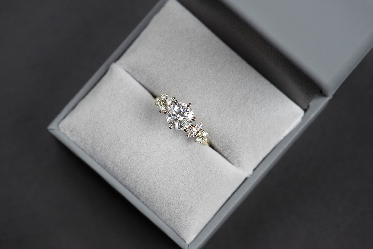Jak zwykle jesteśmy otwarci na pomysły naszych klientów – zarówno kamień główny jak i boczne możemy zastąpić innymi minerałami i stworzyć spersonalizowane połączenie kolorystyczne. W pracowni pracujemy również z bardziej niestandardowymi wersjami diamentów, czyli diamentami sól i pieprz oraz czarnymi diamentami. W naszej ofercie standardowo znajdują się kamienie o średnicy 4 i 5 mm, ale możemy oprawić większy kamień. Pytania? Zapraszamy do kontaktu!