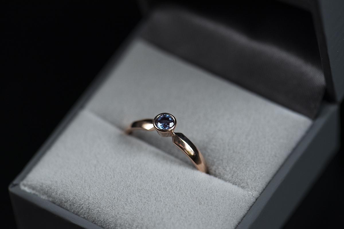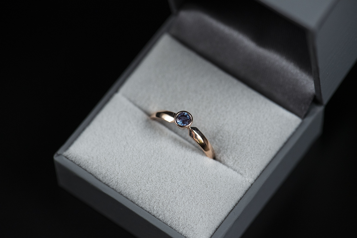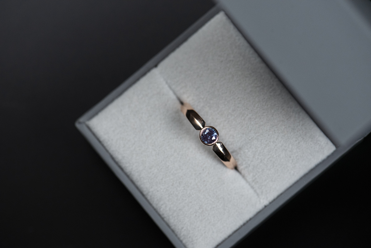 Pierścionek ze złota z aleksandrytem ma prostą i dość nowoczesną formę. Trójkątny profil obrączki dodaje mu wizualnej lekkości, a kamień (który sam w sobie jest niezwykły) jest dodatkowo eksponowany przez jej zwężające się końce. Więcej o pierścionkach Klinga przeczytasz w galerii.
